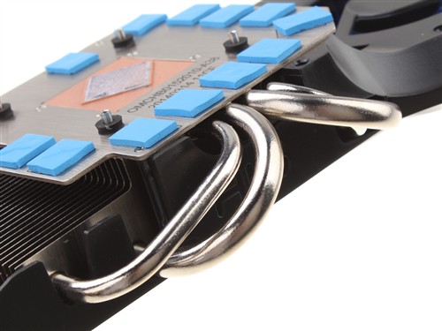 作為渦輪散熱器,散熱鰭片一般都不會很大,但是通常都很厚實(shí),這款顯卡在散熱鰭片方面的用料沒有忽視,鋁制顯存散熱片下方便是純銅導(dǎo)熱板,配合兩粗兩細(xì)的導(dǎo)熱管,有效地傳遞了核心的熱量,導(dǎo)熱效果出色,不過熱管方面,兩跟粗熱管十分不錯(cuò),用料十足,但是兩根細(xì)的就有點(diǎn)寒酸了,真得很細(xì)。